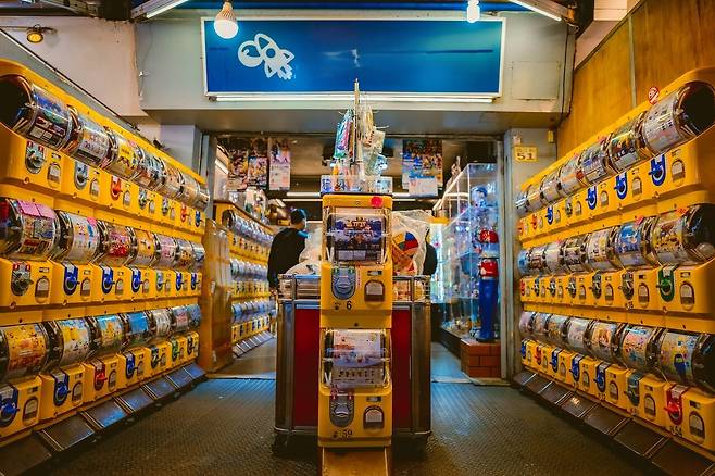 사용자가 동전을 넣고 손잡이를 돌리면 랜덤으로 캡슐이 나오는 방식으로, 주로 애니메이션, 게임, 영화 등의 인기 캐릭터들이 포함된 상품이 많아 새로운 일본 놀거리로 자리잡게 되었죠.