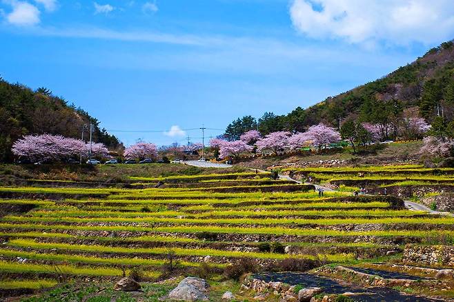 마을 뒤편 산비탈에는 약 2만 평에 달하는 다랑논이 형성되어 있으며, 그 다랑논에는 봄이면 유채꽃이, 가을이면 메밀꽃이 피어나 계절마다 전혀 다른 모습을 보여줍니다.