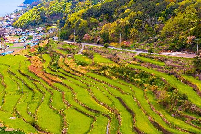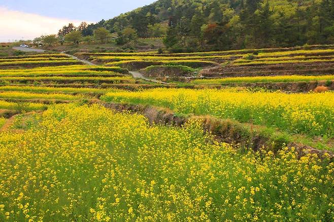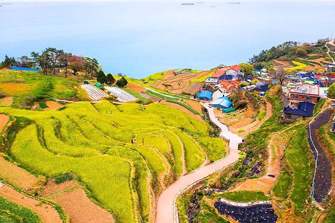 가파른 산비탈을 깎아 만든 계단식 다랑논에 핀 유채꽃과 푸른 남해바다가 어우러지는 풍경은 보는 것만으로도 힐링이 되는 장면입니다.