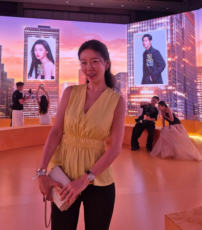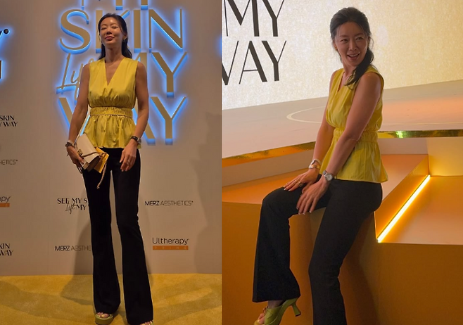안선영은 브이넥 베이지 베스트와 블랙 부츠컷 팬츠를 매치하여 우아한 무드를 완성했습니다. 베스트는 주름 디테일로 멋스러움을 더했으며, 가방은 클러치로 스타일리시함을 강조했습니다. 통굽 샌들로 편안하면서도 세련된 느낌을 더해 완벽한 미니멀한 스타일을 보여주었습니다.