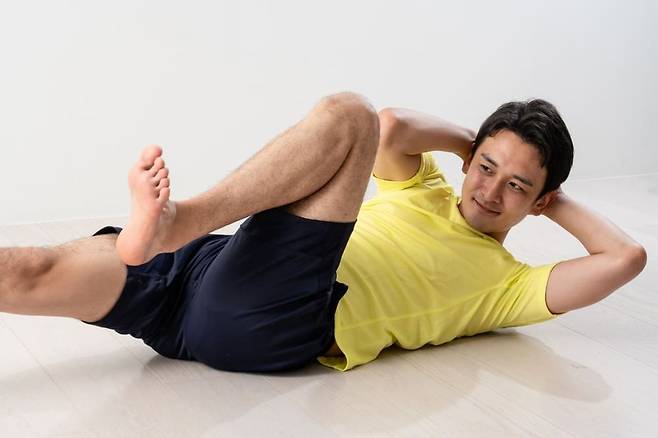 바닥에 누워 양손은 머리 뒤에, 다리는 공중에 듭니다.