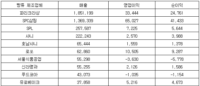 [표] 지난해 빵류 제조업체 매출 상위 10곳 (단위: 백만원)