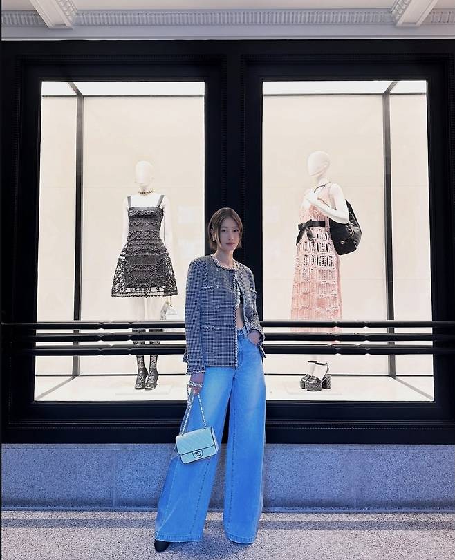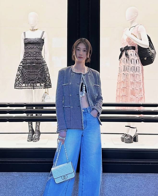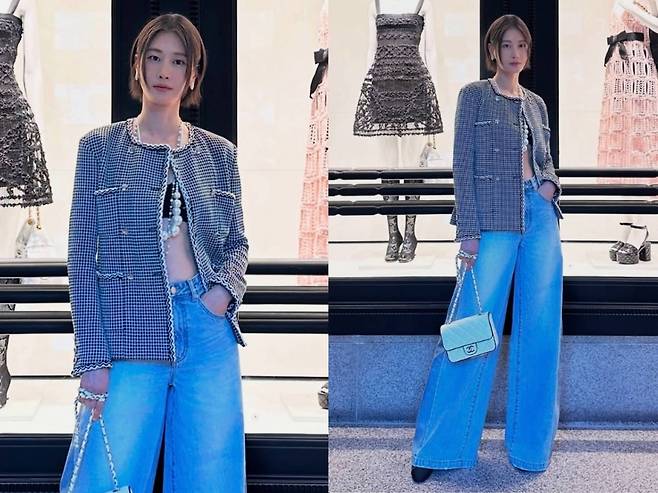 샤넬 부티크 앞에서 트위드 재킷과 와이드 데님 팬츠를 매치한 이현이는 고전적인 체크 트위드 재킷 안으로는 크롭 이너탑을 드러내며 과감함을 더했고, 진주 네크리스와 화이트 샤넬 플랩백으로 명품 포인트를 완성했습니다.