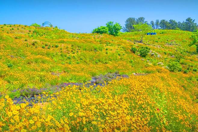 선창마을회관 뒤쪽 공영주차장에서 산책로를 따라 올라가면 만날 수 있는 이 꽃동산은, 매년 5월 중순부터 라벤더와 노란 금계국이 차례로 피어나며 색다른 경관을 연출합니다.