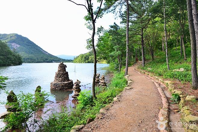 둘레길을 걷다 보면 물가와 숲 가장자리에 세워진 돌탑들이 눈에 들어온다. 파란 하늘과 초록 나무, 고요한 수면과 어우러진 돌탑 풍경은 이곳만의 몽환적인 느낌을 완성한다.