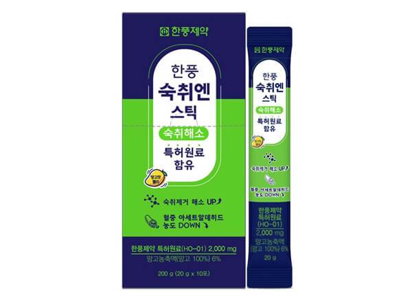 한방 분야에서 유명한 한풍제약은 ‘한풍 숙취엔 스틱’을 공급하고 있다. 망고의 맛과 향을 담은 스틱형 젤리 숙취해소제로, 한 포만 먹어도 혈중 아세트알데히드 농도를 떨어트릴 수 있다. 본 제품에는 아세트알데히드 농도를 낮추는 한풍제약의 특허 물질이 2000㎎ 함유돼 있으며, 맛을 내기 위한 망고 농축액도 6% 포함돼 있다. 판매 가격은 오프라인 판매점 중심, 한 포 기준으로 3,000원 내외로 형성돼 있다.