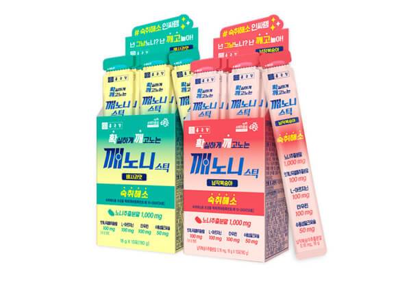 종근당은 스틱형 젤리 타입 숙취해소제 ‘깨노니 스틱’ 2종을 출시했다. 숙취 효능에 관한 제조 공법 특허를 받은 노니트리를 주원료로 삼아 숙취 해소 효능이 우수한 제품이다. 숙취해소제의 맛을 중시하는 최근 트렌드에 맞춰 ‘배사과맛’과 ‘납작복숭아맛’의 2종류로 구성했다. 젤리 타입의 스틱형 개별 포장으로 휴대성과 섭취 편의성을 높였다. 10포 구성 패키지의 공식몰 판매가는 16,500원이다.