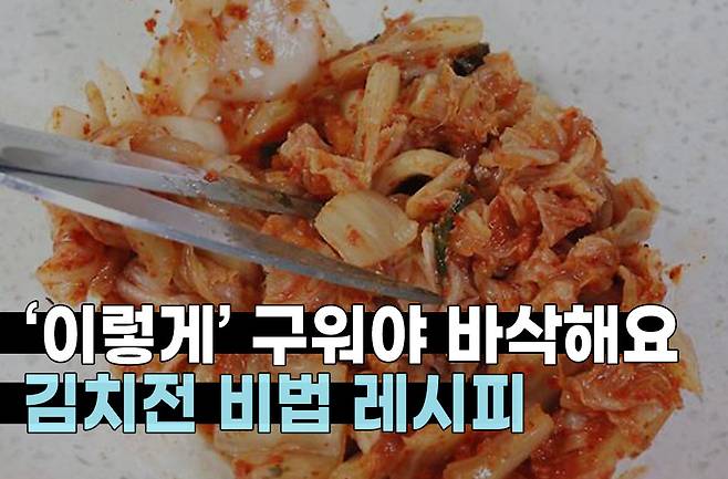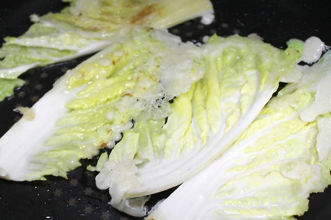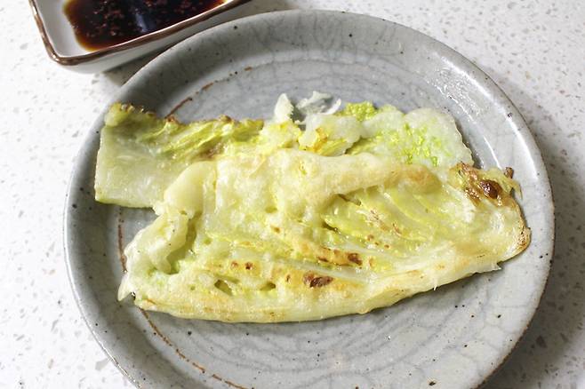 달군 팬에 식용유를 두르고, 배추에 반죽을 묻혀 앞뒤로 노릇하게 부쳐줍니다.