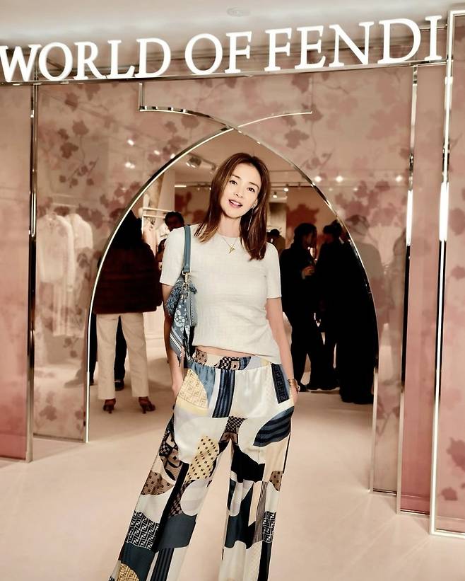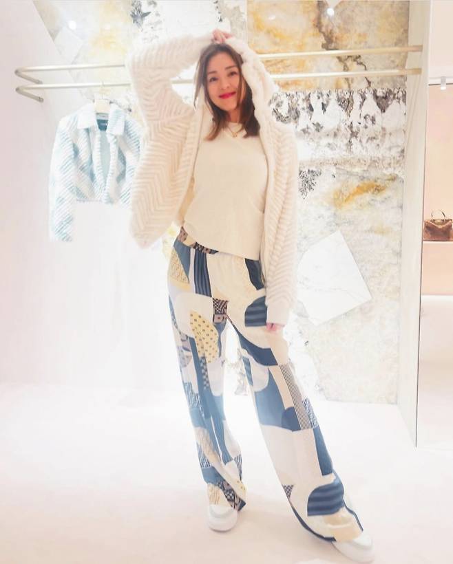 야노시호는 한 프리미엄 브랜드 행사장에서 패턴 와이드 팬츠에 화이트 니트 톱을 매치해 세련된 리조트 무드를 완성했습니다.