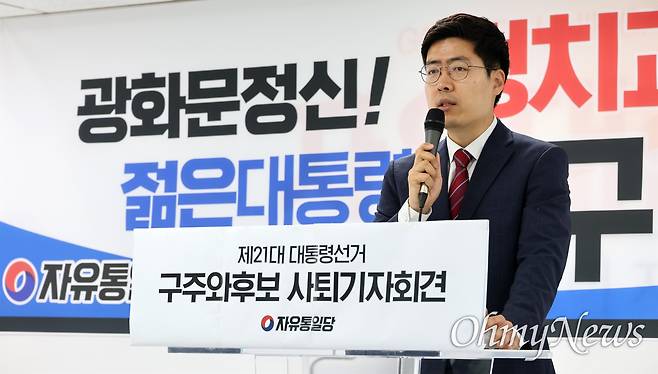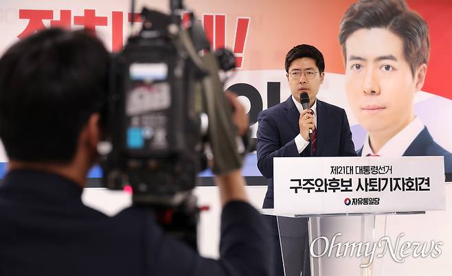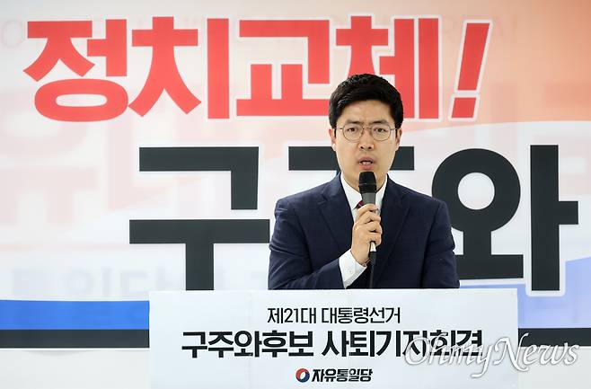 자유통일당 구주와 후보가 19일 오전 서울 영등포구 자유통일당사에서 기자회견을 열어 대선후보 사퇴 및 '국민의힘 김문수 대통령 후보 지지선언'을 하고 있다.
