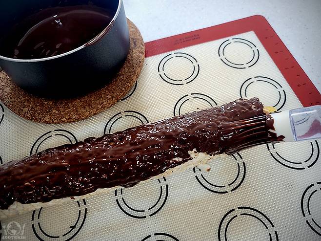 둘둘 말은 라이스 크리스피가 식으면 녹인 초콜릿을 붓으로 발라줍니다.
