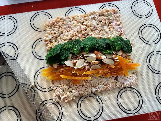 라이스 크리스피를 버터 바른 실리콘 페이퍼 위에 펼칩니다. 그리고 말린 망고, 아몬드 슬라이스, 민트를 깔고 김밥 말듯 말아줍니다.