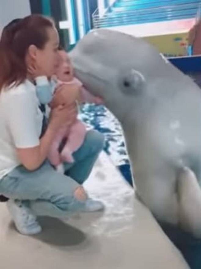 아니 차가운 돌고래 입이 아기에게 닿아서 놀랐는지