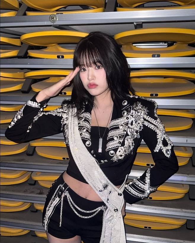 안유진은 강렬한 블랙 세트업에 실버 장식과 체인 디테일이 더해진 의상을 완벽하게 소화하며 압도적인 포스를 자랑했습니다.