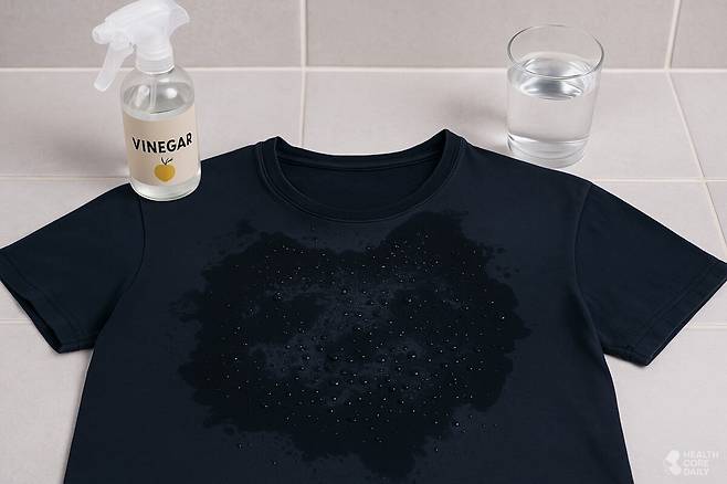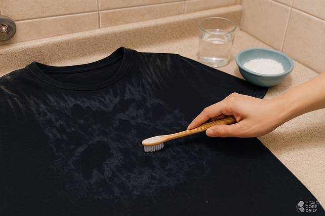 검은 옷에 하얗게 남은 땀 얼룩은 소금물로 간단히 제거할 수 있다. 따뜻한 물 500ml에 소금 한 숟가락을 녹여 얼룩 부위에 적신 뒤 약 10분간 두었다가 칫솔이나 손가락으로 부드럽게 문질러준다. 이후 미지근한 물에 헹궈내면 대부분의 얼룩이 사라진다.