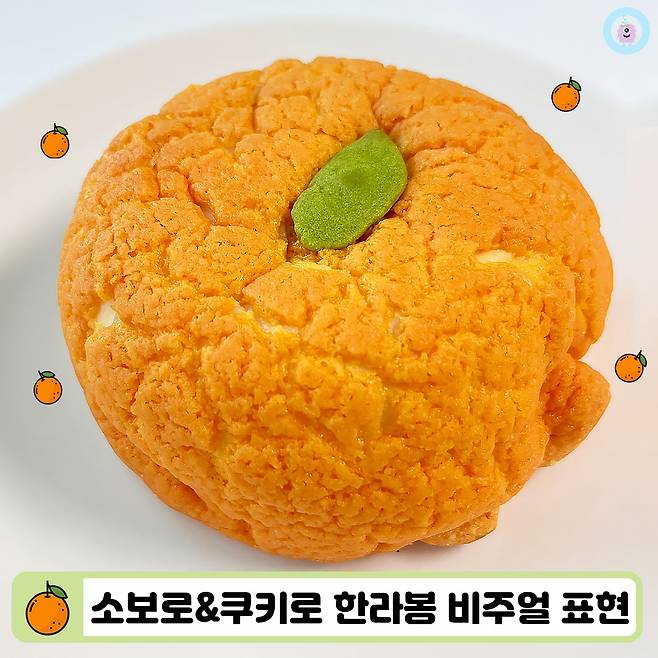 한라봉 생크림빵은 오렌지색 소보로로 한라봉의 울퉁불퉁한 표면이 표현되어 있어요. 위에 초록색 빵까지 얹어서 귀여운 한라봉 비주얼이 완성되었답니다ㅋ.ㅋ
