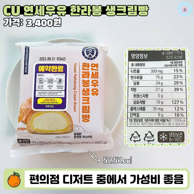 연세우유 한라봉 생크림빵은 3,400원에 판매되고 있어요. 편의점 프리미엄 디저트가 최소 3천원대 후반인 것에 비하면 가성비가 좋은 편이에요!