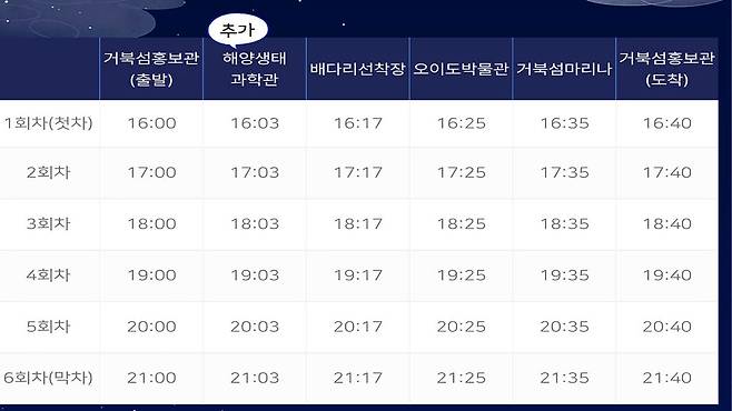 기존 오전 10시부터 오후 8시까지였던 시흥 2층버스 운행 시간은 8월 6일부터 오후 4시부터 밤 10시까지로 변경됐다. 특히 가장 마지막 운행인 오후 9시 버스는 거북섬홍보관 정류장에서 출발하며, 총 여섯 차례의 운행을 마무리한다.