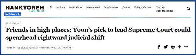진보 성향의 매체인 한겨레는 윤석열 대통령이 이균용 후보자를 대법원장으로 임명코자 했을 때, 그가 우경화를 Spearhead할 수 있다는 우려를 표했어. 결과적으로 이균용 후보자는 임명동의안이 부결되며 낙마했어.