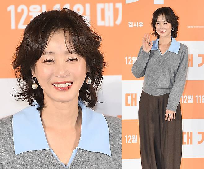 김성령은 편안하면서도 세련된 감각을 살린 그레이 니트에 소프트한 블루 칼라 포인트를 더한 룩으로 차분한 매력을 자아냈습니다.