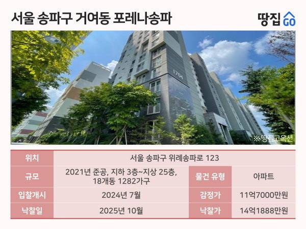 국내 최초 AI경·공매 퀀트 플랫폼 땅집고옥션(☞바로가기)에 따르면 해당 물건은 송파구 거여동 ‘포레나송파’ 1층 전용면적 66㎡다. 2021년 신축한 아파트다. 채권자인 한국자산관리공사가 임의경매를 신청해 2024년 7월 개시 결정이 났다.