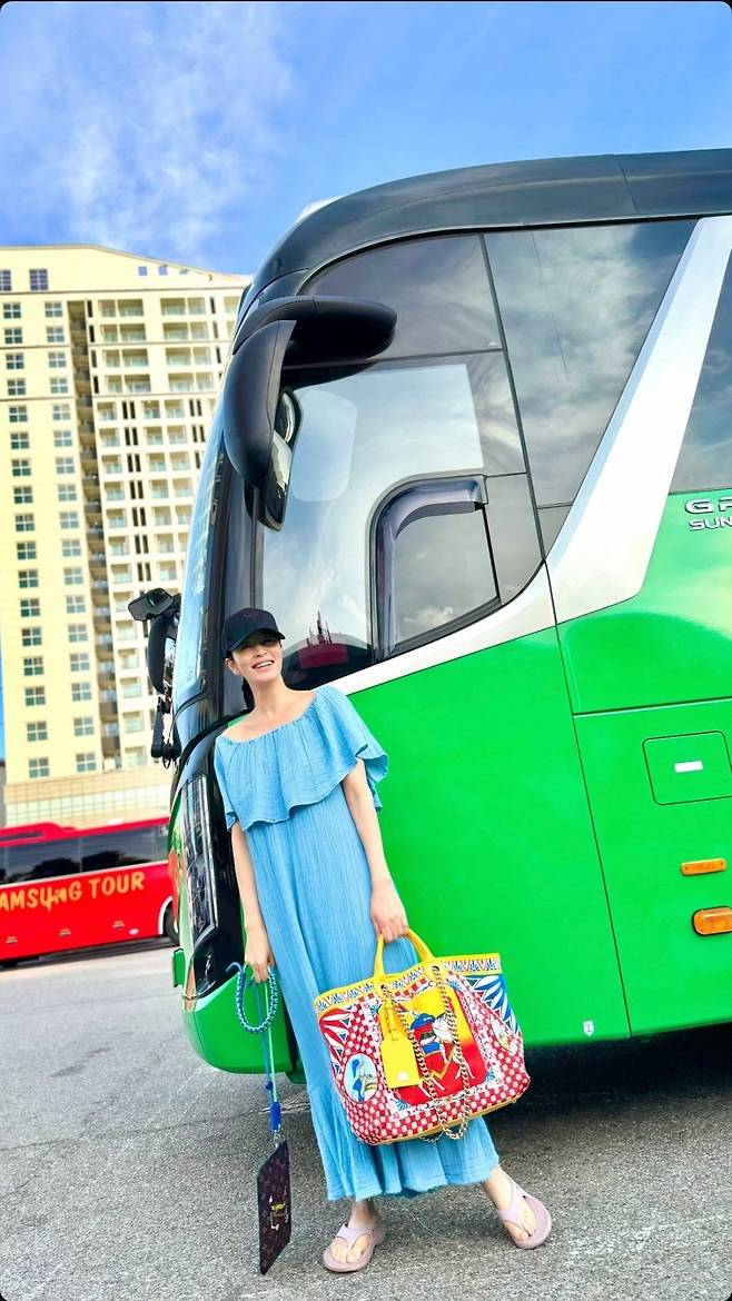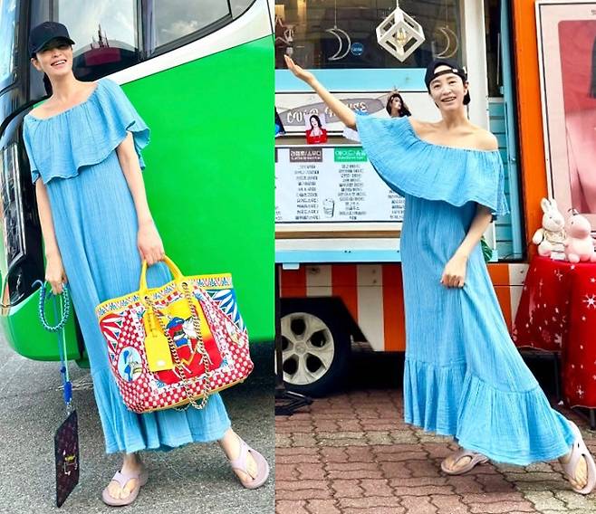 김혜수는 하늘빛이 감도는 오프숄더 플리츠 맥시드레스를 입고 여유로운 분위기를 자아냈으며, 슬리퍼와 블랙 야구 모자, 컬러풀한 프린트 토트백을 매치해 편안하면서도 센스 있는 스타일링을 선보였습니다.