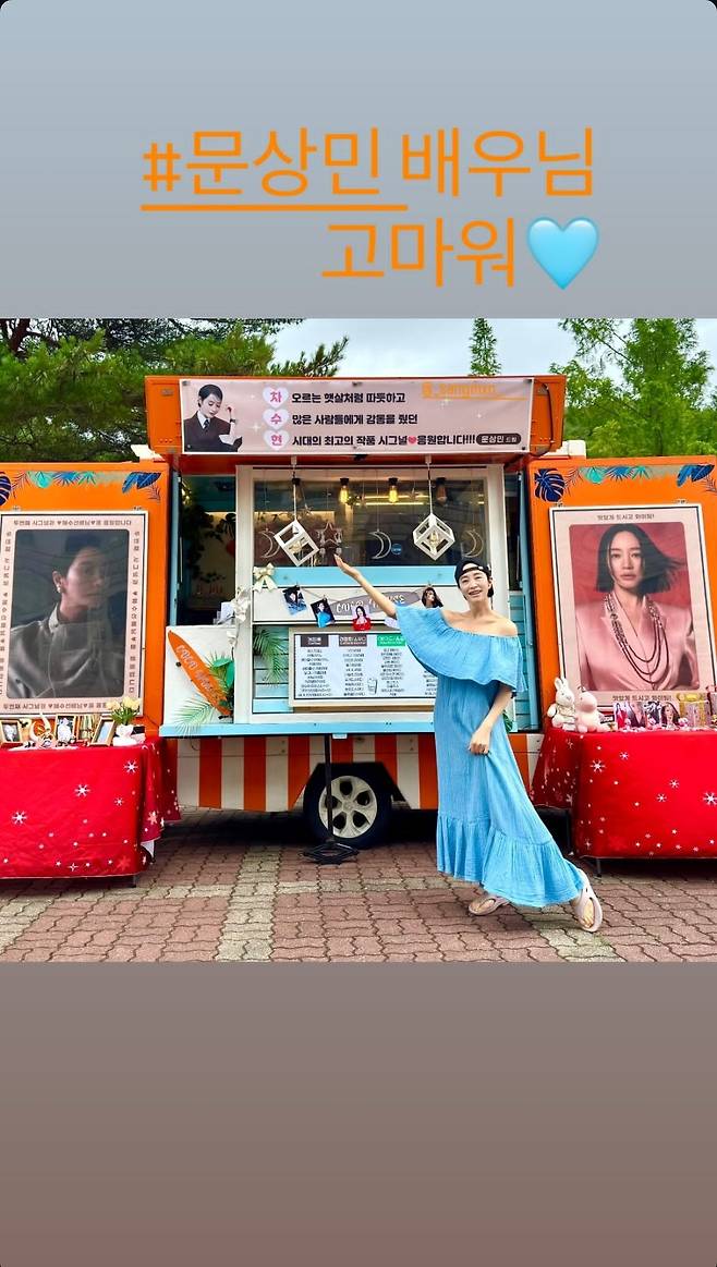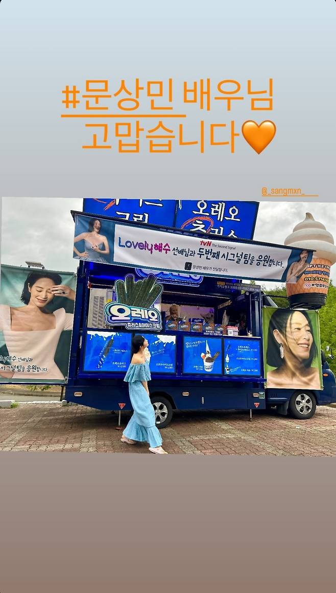 김혜수가 드라마 촬영 현장에서 배우 문상민이 보낸 커피차를 인증하며 화사한 여름 패션으로 눈길을 끌었습니다.