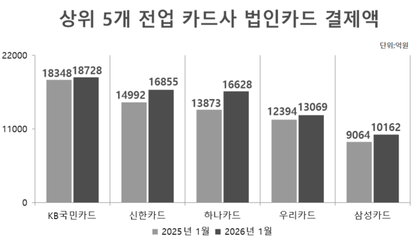 눈에 띄는 것은 하나카드의 점유율 변화다. 1월 8개 전업카드사(삼성·신한·현대·KB국민·하나·우리·롯데·비씨)의 법인카드 결제액 9조1302억원 중 하나카드의 비중은 18.2%로 전년동월(16.7%) 대비 1.5%p 늘었다. 현재 국민카드(20.5%)와 신한카드(18.5%)에 이어 3위지만 점유율 차이를 좁히고 있다.