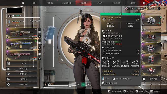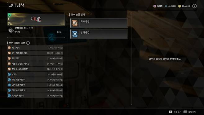 '외장 부품'은 아까 도입부에서 학살자 4셋을 맞췄기에 옵션이 잘 떴다면 일단은 그대로 사용해도 괜찮다. 최대 체력, 최대 정신력, 비전투 중 정신력 회복량 등이 노란색 옵션이면 일단은 그냥 사용해도 괜찮다.
