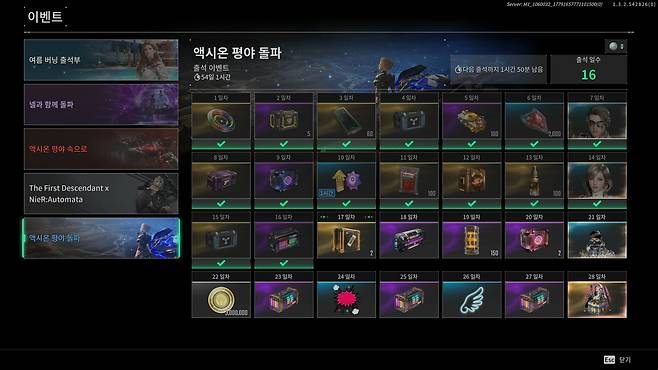 그런 다음, 엑시온 평야 돌파라고 불리우는 출석 이벤트를 체크해보자. 이걸 잘 활용해야 한다. 4일차와 15일차에 '엑시온 평야 연구 도면 선택 상자'라고 아이템 확정권을 증정한다. 이걸 받아서 잘 보관해 두도록 하자. 절대 미리 개봉해선 안된다. 절.대.로.