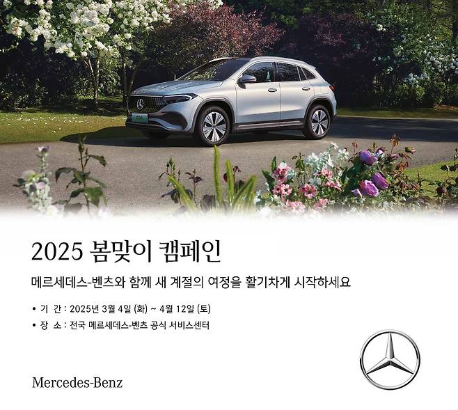 메르세데스-벤츠 코리아는 무상 서비스 기간이 만료된 고객을 대상으로 봄철 안전한 주행을 돕기 위해, 4월 12일까지 차량 무상점검 및 계절성 부품 할인 혜택을 제공하는 ‘2025 봄맞이 캠페인’을 진행한다고 밝혔다.