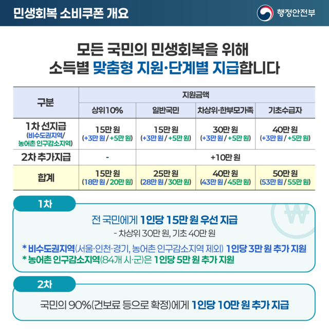 비수도권 국민에는 3만원, 인구감소지역은 5만원이 추가 지급된다. 2차 소비쿠폰까지 포함할 경우 1인당 최소 15만원에서 최대 55만원까지 받을 수 있다.