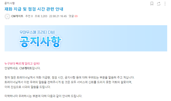 가장 중요한 이슈였던 인게임 재화 지급에 대해 CM게이트는 "한국 우마무스메 프리티 더비는 운영계획을 수립할 때 각 국가별로 공휴일, 기념일 등의 일정이 차이나는 부분을 고려하고 있다"며 "부득이하게 다른 언어 서비스와는 지급 조건 및 시기가 완전히 동일하게 진행되고 있지 않은 점 우선 양해를 부탁한다"고 사과의 말을 전했다.