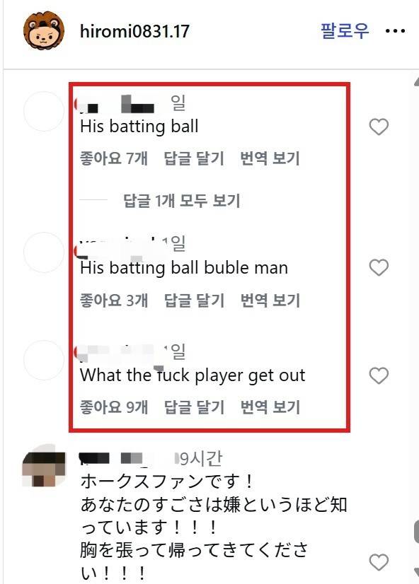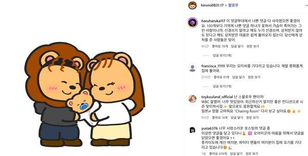 그러나 해당 게시물의 최신 댓글에는 "꺼져라", "너의 공은 배팅볼이다" 등의 비난 댓글과 함께 "WBC 수고 많았습니다. 누가 뭐라고 해도 항상 응원합니다", "쓰레기 같은 댓글은 신경 쓰지 말고 이번 시즌도 힘내세요" 등 그를 격려하는 메시지들이 뒤섞였다.