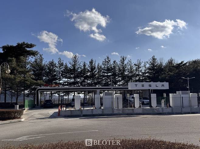 테슬라 차량의 고속도로 휴게소 충전 편의 개선 여부를 알아보기 위해 22일 충남 공주시에 위치한 정안알밤휴게소 천안 방향을 찾았다. 정안알밤휴게소 천안 방향 입구에서는 테슬라 슈퍼차저 충전기 설치 위치를 쉽게 찾을 수 있다. 파란색 유도선을 따라 들어가면 테슬라의 최신 V4(4세대) 슈퍼차저 8기를 볼 수 있다. 해당 충전기들은 SK시그넷이 설치한 충전소 맞은편에 위치해 있다.