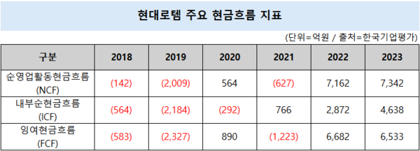 NCF는 기업이 투자 혹은 차입금 상환에 사용할 수 있는 현금창출력을 보여주는 잣대다. 지난해 현대로템의 NCF는 7342억원을 기록했다. 2021년(-627억원)에 비해 7000억원 가까이 늘었다. 자연히 NCF에서 배당금과 자본적지출(CAPEX) 등을 뺀 나머지 지표도 좋아졌다. 영업 및 투자자산 처분 시 확보할 수 있는 내부순현금흐름(ICF)은 2021년 766억원 순유입으로 돌아선 뒤 2022년 2872억원, 2023년 4638억원을 기록했다.