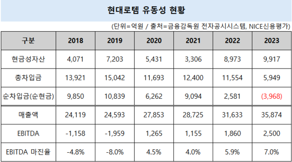 현대로템이 순현금 상태로 돌아선 것은 뛰어난 현금창출 능력과 관련돼 있다. 2017년부터 매년 매출 2조원대를 실현해왔으며 지난해에는 3조5874억원으로 크게 증가했다. 이에 2019년까지 적자였던 EBITDA도 2020년 1265억원으로 흑자전환했다. 이어 2022년 1860억원, 지난해 2500억원으로 각각 집계됐다. 2020년 4%대 중반이었던 EBITDA 마진율은 지난해 7%로 올라섰다.