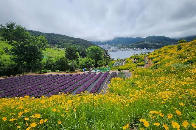 수국, 라벤더 등 계절마다 달라지는 꽃과 저멀리 지세포항의 풍경까지 내려다볼 수 있어요. 참고로 5월 21일 기준, 보랏빛 라벤더 만개해 방문자들을 맞이하고 있다고 해요!