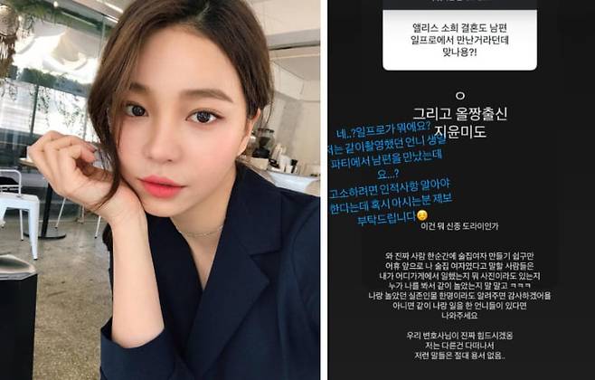 지난 31일 지윤미는 SNS를 통해 팬들과 Q&A를 진행했습니다. 한 누리꾼은 “앨리스 소희 결혼도 남편 일프로에서 만난 거라던데 맞나요? 그리고 얼짱 출신 지윤미도”라는 질문을 했고, 지윤미는 이 질문을 박제하며 반박했습니다.
