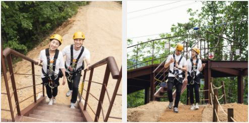 짚라인은 총 5개의 코스로 구성되어 있으며, 가장 긴 코스는 약 1km에 달합니다. 공중에서 빠른 속도로 내려오며 보는 가평의 전경은 정말 아름답고, 특히 강을 가로지르는 순간은 잊을 수 없는 경험이 될 거예요. 짚라인을 타기 전에 간단한 안전 교육을 받게 되는데, 직원들이 친절하게 설명해 주니 초보자도 금방 익힐 수 있습니다.