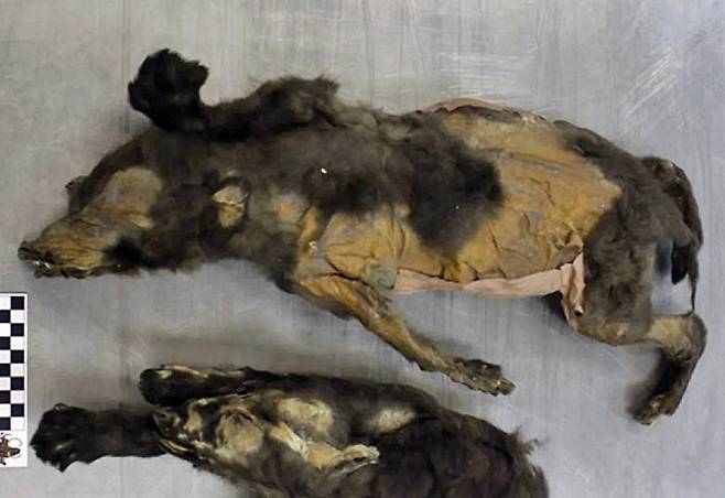 나단 웨일즈 교수는 "시베리아 북부 투마트에서 약 40㎞ 떨어진 샤라흐 지역에서 2011년과 2015년 강아지로 추측되는 사체가 각 1구씩 나왔다"며 "모두 꽁꽁 얼어붙어 피부와 털, 치아, 내장, 심지어 위 내용물까지 남아 있었다"고 설명했다.