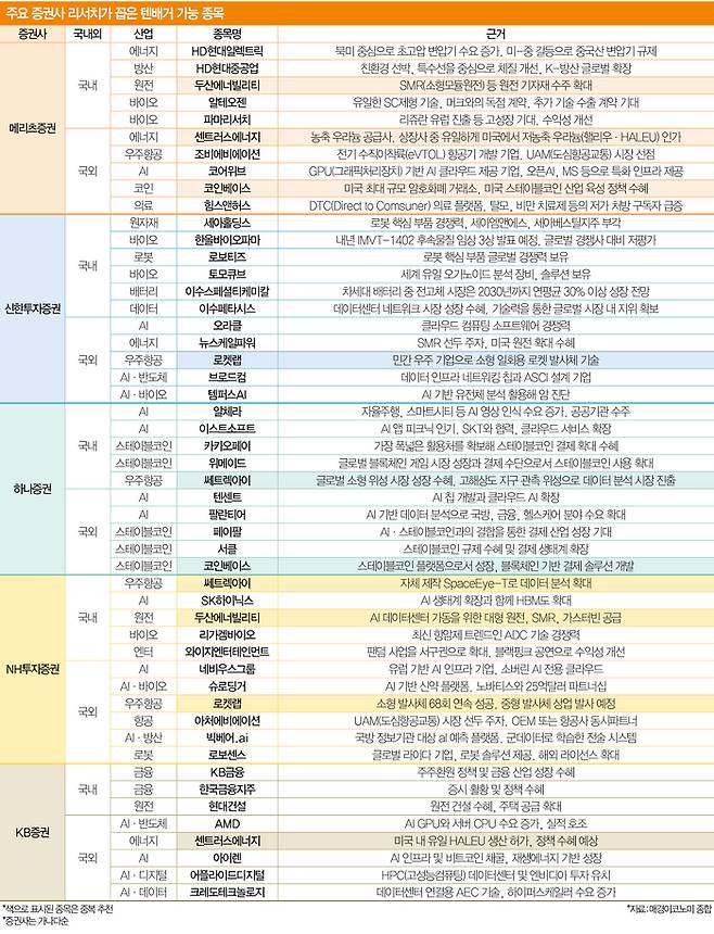 매경이코노미는 주요 증권사 리서치(메리츠증권·신한투자증권·하나증권·NH투자증권·KB증권)에 텐배거가 가능한 산업과 구체적인 종목을 물었다. 결론적으로 미래 성장 산업은 AI, 로봇, 제약·바이오, 항공우주·방산, 스테이블코인이다.