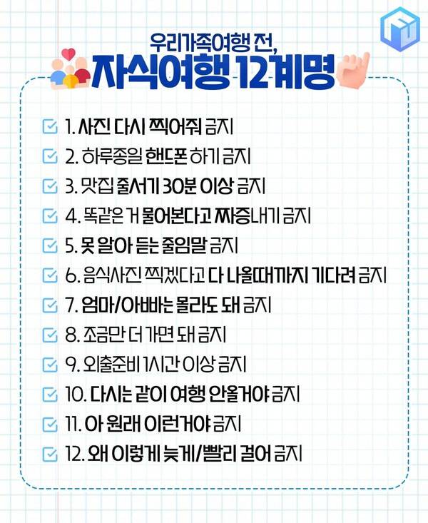 최근, 에디터는 가족여행 서약서를 만들어 부모님과 작성한 뒤 해외여행에 다녀왔습니다. 처음엔 15계명을 읽으며 "뭐가 이렇게 하지 말라는 게 많냐"라고 했던 아버지도, 자식 12계명을 읽으며 웃음을 터트리셨는데요.