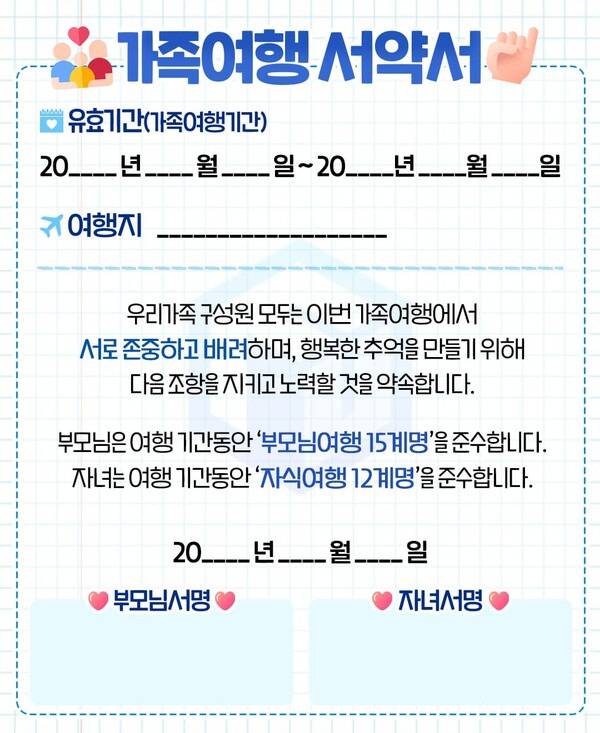 여러분의 가족여행도 그러하길 바라는 마음에 가족여행 서약서를 공유해봅니다. 평소 쉽게 오지 않는 가족여행 시간, 집에서와 마찬가지로 다툼이 아예 없을 수는 없습니다. 다만 '여행'이라는 상황에서만큼은 조금 특별하게 갈등을 재미로 풀어낼 수 있을 겁니다.