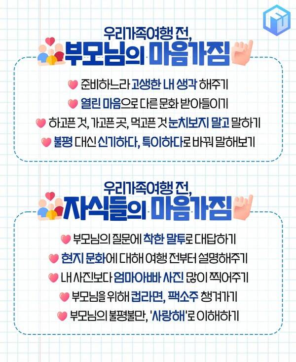 한 번의 가족여행이 행복한 추억으로 남는다면 다음에도, 그 다음에도 가족여행을 설레이며 준비할 수 있겠죠? 서로 배려하는 마음을 갖고 이번 가족여행도 즐거운 추억으로 만들어보시길 바랍니다 :)