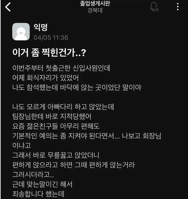 회식자리에서 아빠다리하고 앉았다고 한소리 들었다..