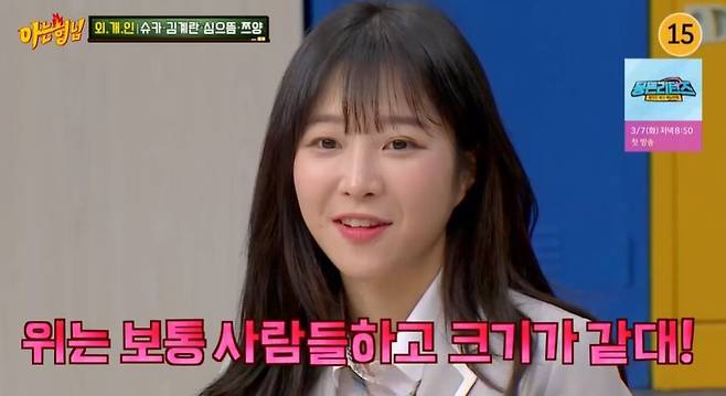 이날 ‘아는 형님’ 출연자들이 쯔양에게 물은 건 ‘배부름’을 느끼느냐는 것. 이에 쯔양은 “나도 당연히 배가 부를 때가 있다. 단, 20분 정도면 금방 소화가 된다”고 답했다.
