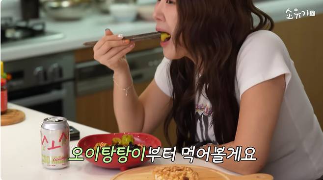 가장 먼저 오이탕탕이를 준비한 소유는 “밥 대신 먹을 거면 푸주, 목이버섯까지 넣어주는 게 좋다. 중국 재료가 많이 들어간다. 두반장도 들어간다”며 “오이 양이 많아 보일 수도 있는데 전 2개 혼자 다 먹을 수 있다. 다이어트지만 많이 먹는다. 오이가 수분이 많아 다이어트할 때 진짜 좋다”고 설명했다.