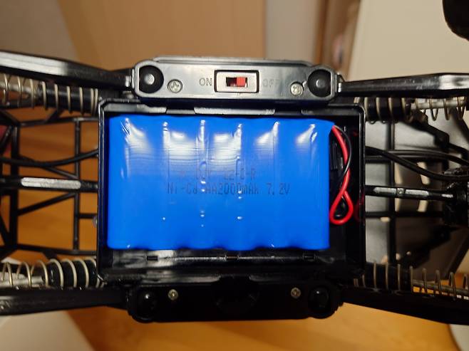 기존 니켈수소 방전된 상태로 전압 찍어보니 6.2V 정도 나오는데 이건 조종기와 무선 연결도 되고 바퀴가 조금씩 움직입니다.