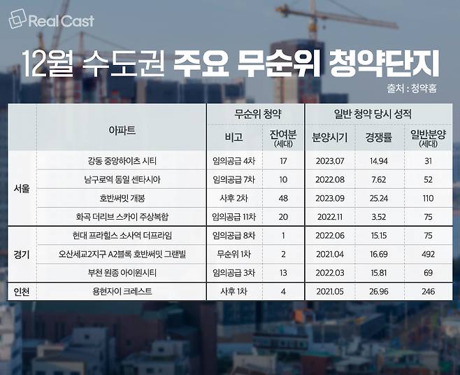 업계 관계자는 “줍줍(무순위 청약)은 계약하지 않아도 아무런 불이익이 없기 때문에, 경쟁률은 높아 보여도 실제 계약까지 진행되는 사례는 적다. 지금 무순위로 나온 단지들은 앞으로도 계속 무순위 일정에서 보게 될 가능성이 높다”고 설명하는 한편, “시장 분위기가 좋지 않으니 상당한 수준의 할인 등 파격적인 조치 없이는 잔여분을 털어내기 쉽지 않을 것”이라고 전했습니다.